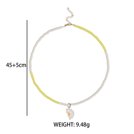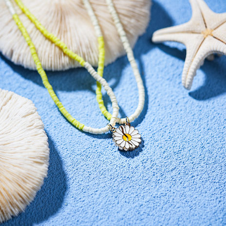 Daisy flower dual-color heishi bead necklace set featuring charming enamel daisy pendant with yellow and white disc beads. Fresh summer-inspired design perfect for retailers targeting customers who love minimalist floral jewelry with contemporary appeal.